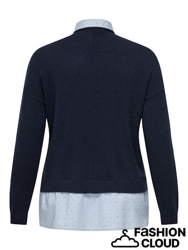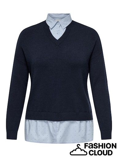 Cardagmar Pullover fra Only Carmakoma er en smart og moderne strik, der kombinerer komfort med et unikt design. Pulloveren er mørkeblå og designet med en påsyet snydeskjorte, der giver et lag-på-lag look uden besværet. Skjortedelen stikker flot frem både forneden og foroven og er dekoreret med små nitter, som tilfører et råt og stilfuldt twist.