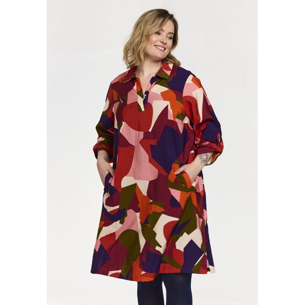 Halsudskæringen er en flot V-hals med knaplukning, kombineret med en skjortekrave, som giver et sofistikeret og stilfuldt udtryk. Tunikaen har to lommer foran på brystsiden, der både er dekorative og praktiske. Det smukke mønster tilfører tunikaen et eksklusivt og moderne look, som passer perfekt til både hverdag og festlige lejligheder.