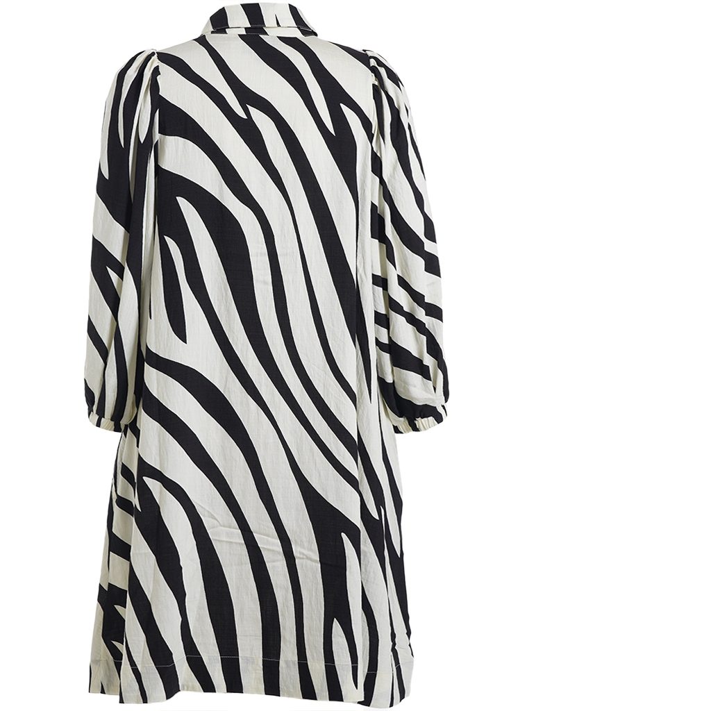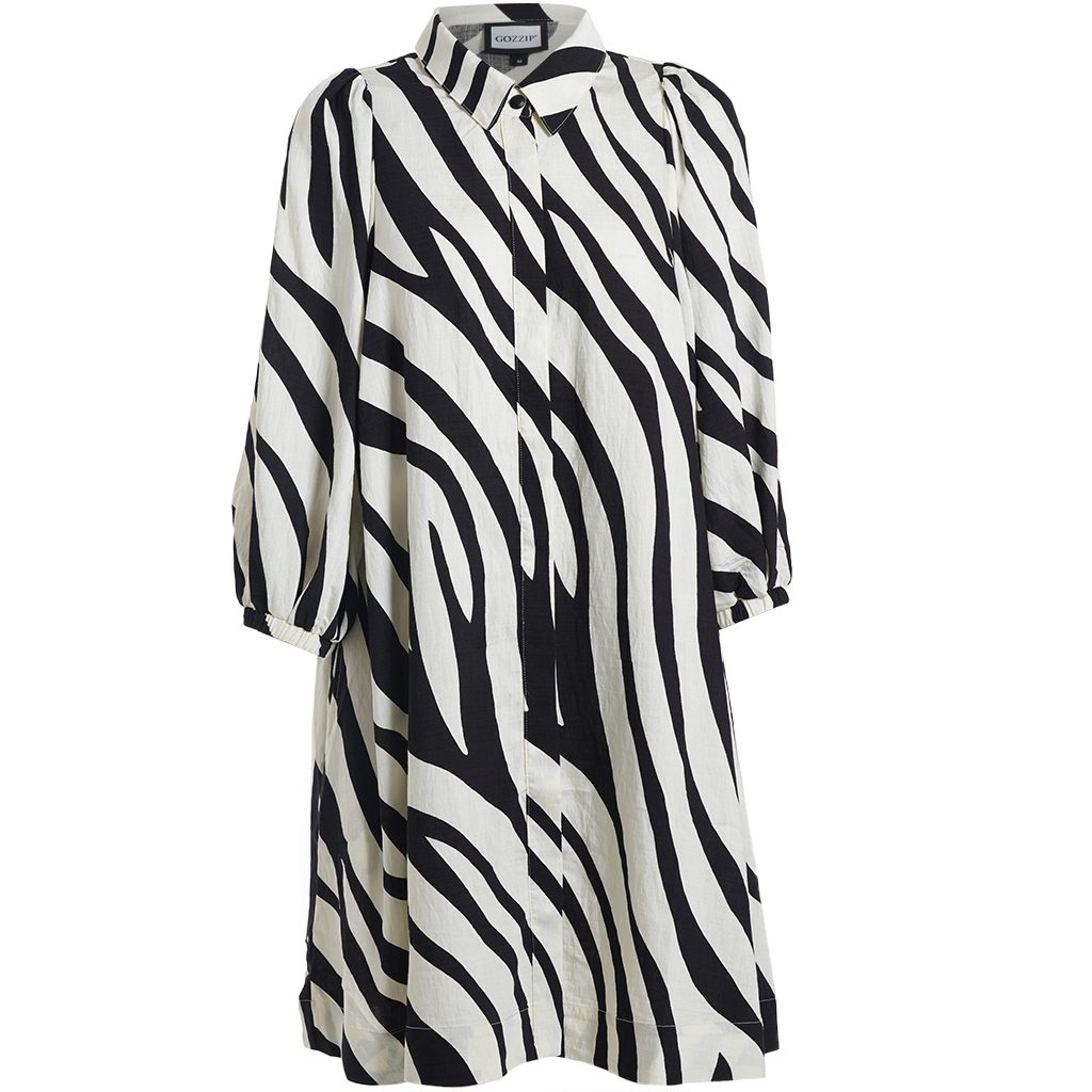 Denne smukke tunika fra Gozzip er fremstillet i en blød og behagelig viscosekvalitet. Modellen har en flatterende A-form, trekvartærmer med elastikafslutning samt en klassisk skjortekrave. Tunikaen er gennemknappet foran med skjult stolpelukning, som giver et elegant og rent udtryk. Designet fuldendes af et iøjnefaldende sort-hvidt asymmetrisk print, der tilfører et moderne og stilfuldt look.