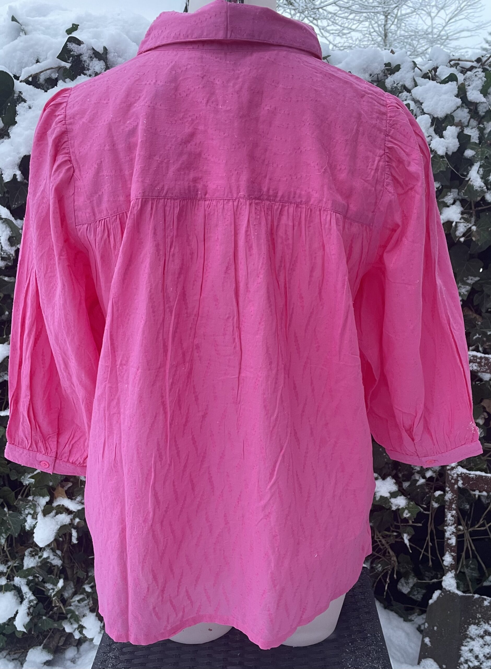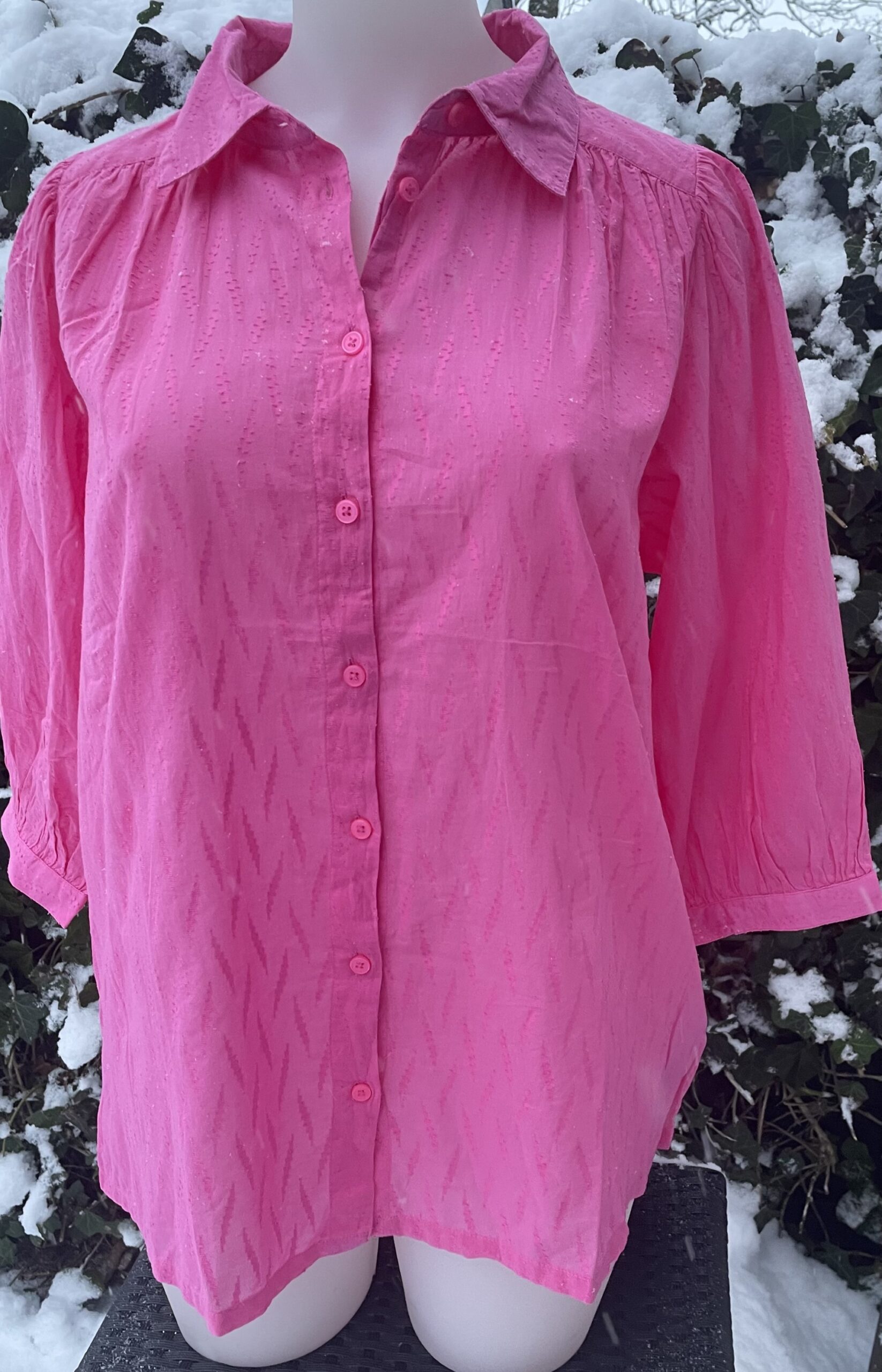 Skjorten er gennemknappet og har et trekvartærme, der kombineres med en diskret puffeffekt på skuldrene, hvilket giver en flot og elegant pasform. Den sidder rigtig pænt på kroppen og er nem at style til både hverdag og mere pæne anledninger.