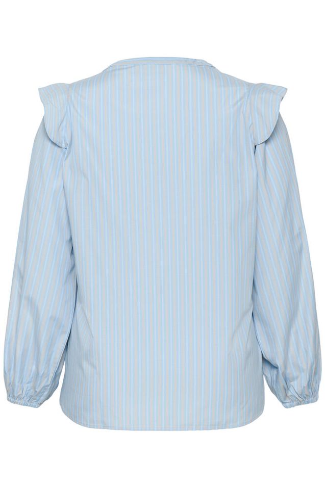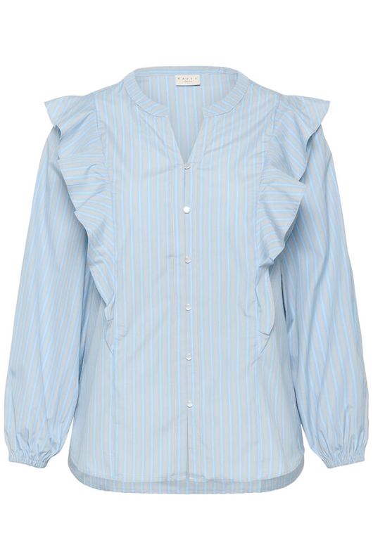 KClenia er en meget smuk stribet skjorte fra Kaffe Curve med fine, feminine detaljer. Skjorten er gennemknappet med flotte marmorerede knapper, der giver et eksklusivt udtryk. Ærmerne har god volumen og afsluttes med elastik, som skaber en elegant og behagelig pasform.