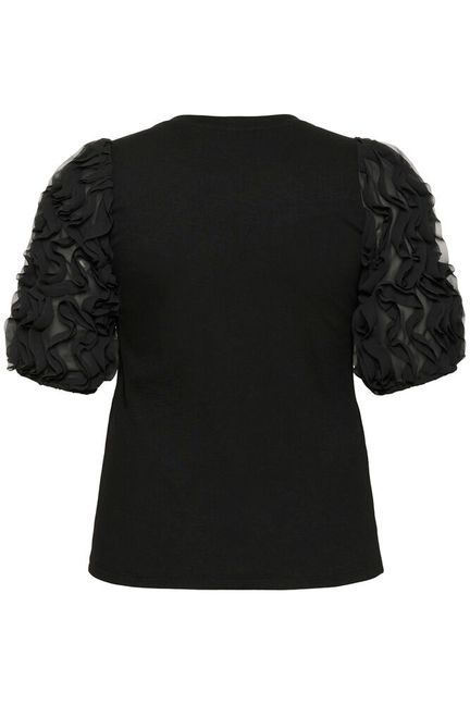 Lucinda Frill T-shirt fra Kaffe Curve er en feminin og stilfuld t-shirt, der løfter ethvert outfit med sine smukke detaljer. Selve blusen er fremstillet i en blød og strækbar kvalitet af 94% viskose og 6% elastan, hvilket giver en behagelig pasform og god bevægelighed. Ærmerne er i 100% polyester og designet med flotte flæser, som giver et eksklusivt og elegant udtryk.