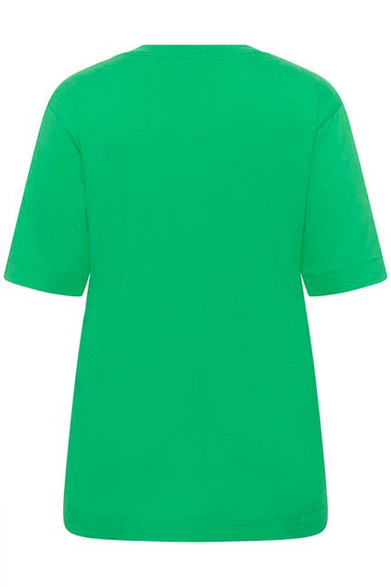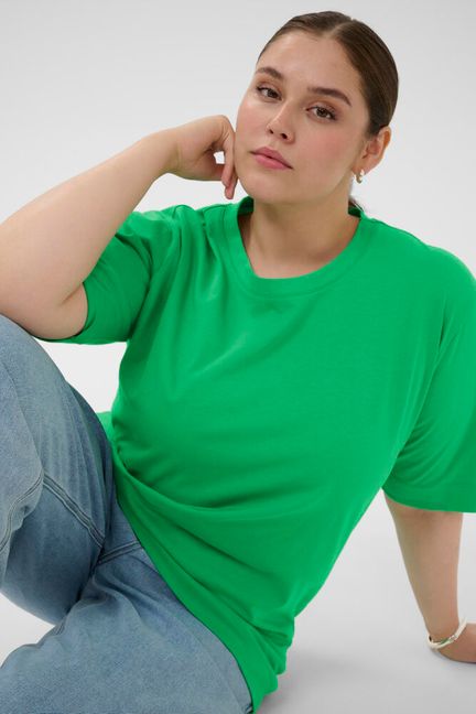 KCmina T-shirten fra Kaffe Curve er en skøn basisfavorit i en ekstra lækker bomuldskvalitet. T-shirten har ¾-ærmer og ekstra længde, som giver en flatterende og behagelig pasform. Den fine, runde hals fuldender det enkle og feminine udtryk. Farven er en smuk, frisk grøn nuance – perfekt til forår og sommer og nem at style både til hverdag og mere afslappede anledninger. En tidløs T-shirt, der hurtigt bliver en fast del af garderoben.