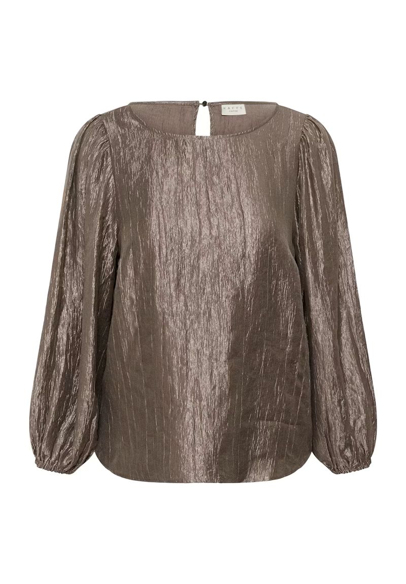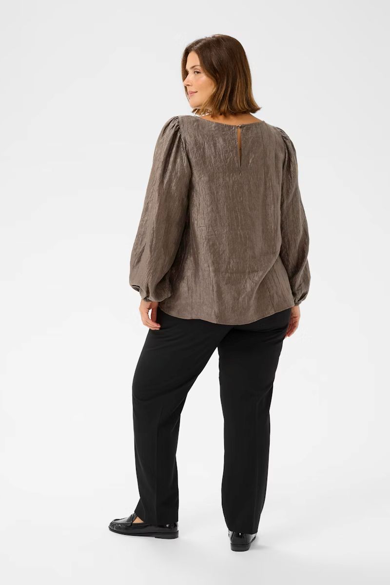 Designet har en fin rund hals med en elegant nøglehulsåbning bagpå, der giver et feminint touch. Ærmerne er let lange og afsluttes med elastik, hvilket skaber en diskret ballon-effekt og gør blusen ekstra klædelig på armen.