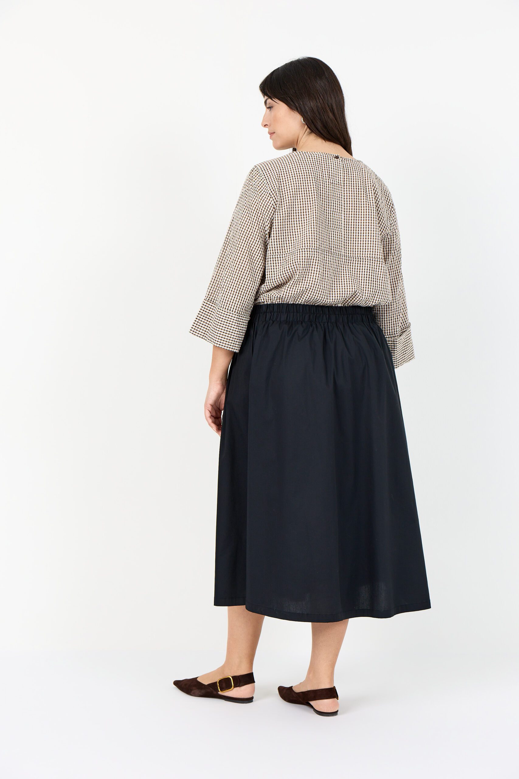 Bagpå er der en dekorativ syning fra nakken, afsluttet med en knap, samt en syning hen over ryggen, der tilfører blusen et stilrent og gennemført udtryk.