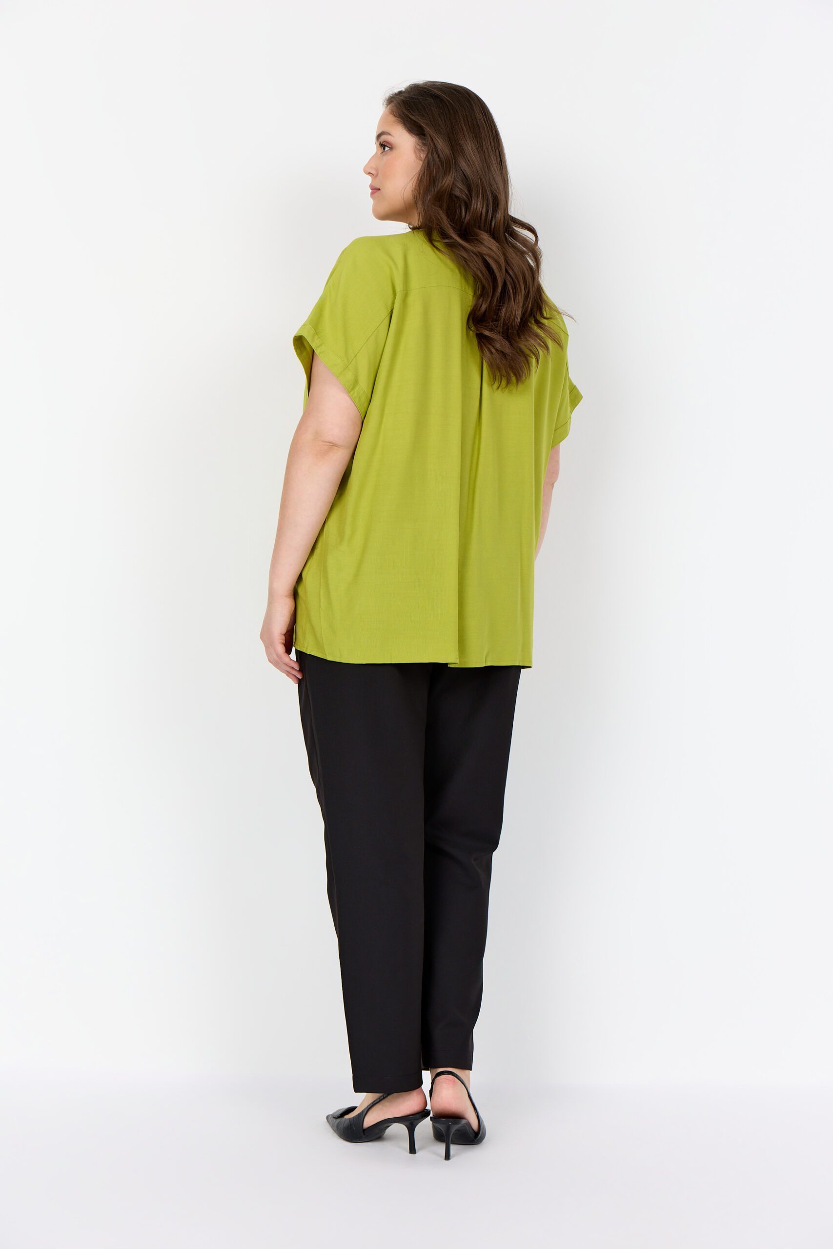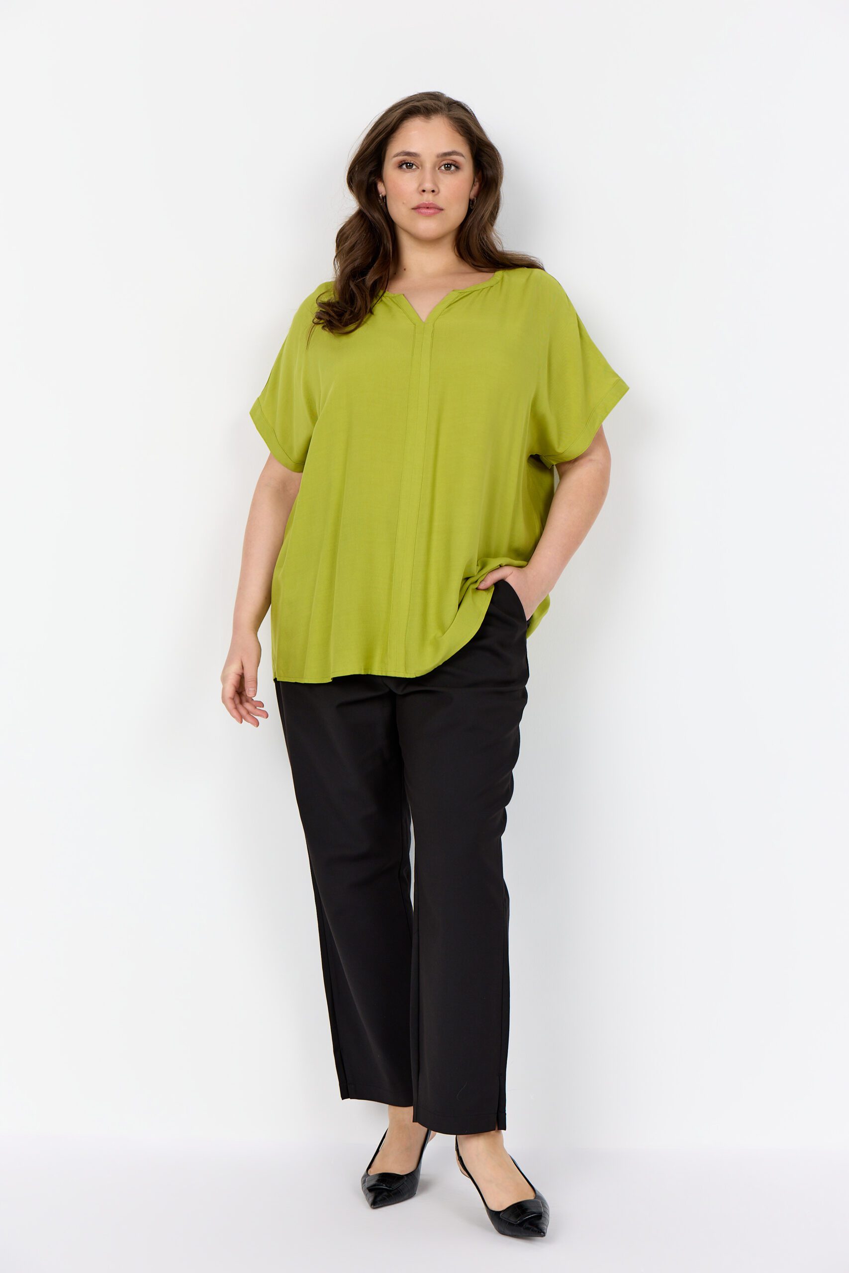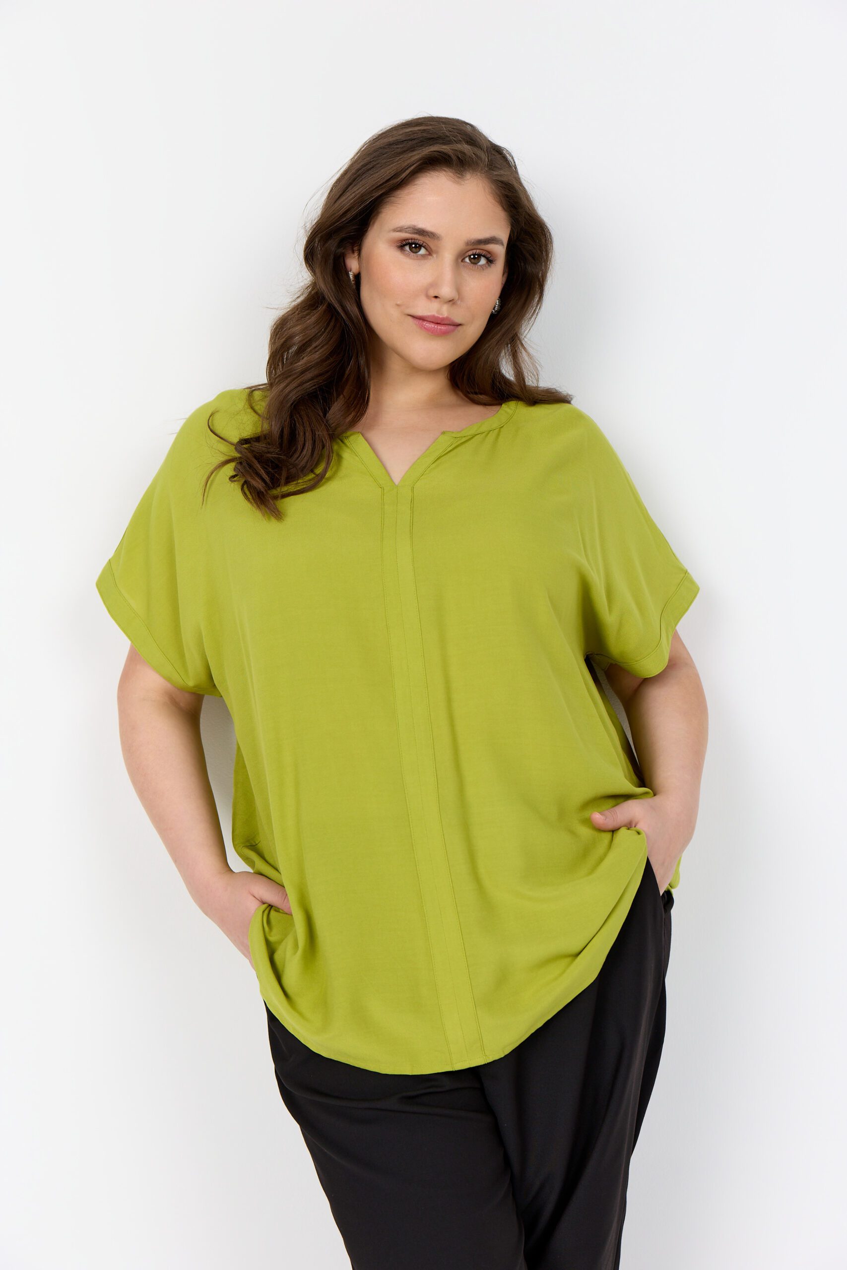 Sia-blusen er fremstillet i 100% viskose i en utrolig blød og lækker kvalitet. Den har et let ærme, der falder smukt og naturligt ned over armen, samt en elegant V-hals, som giver et feminint udtryk. En fin påsyet detalje, der løber ned langs hele blusen, tilfører et eksklusivt og gennemarbejdet look. Blusen fås også i en flot, frisk grøn nuance, som er perfekt til sæsonen. En virkelig smuk bluse med både komfort og stil i fokus.