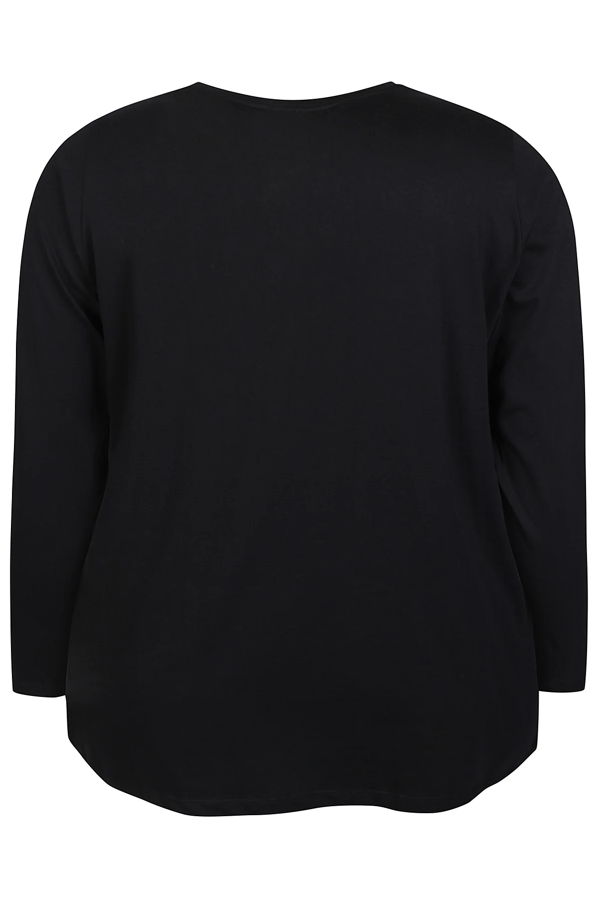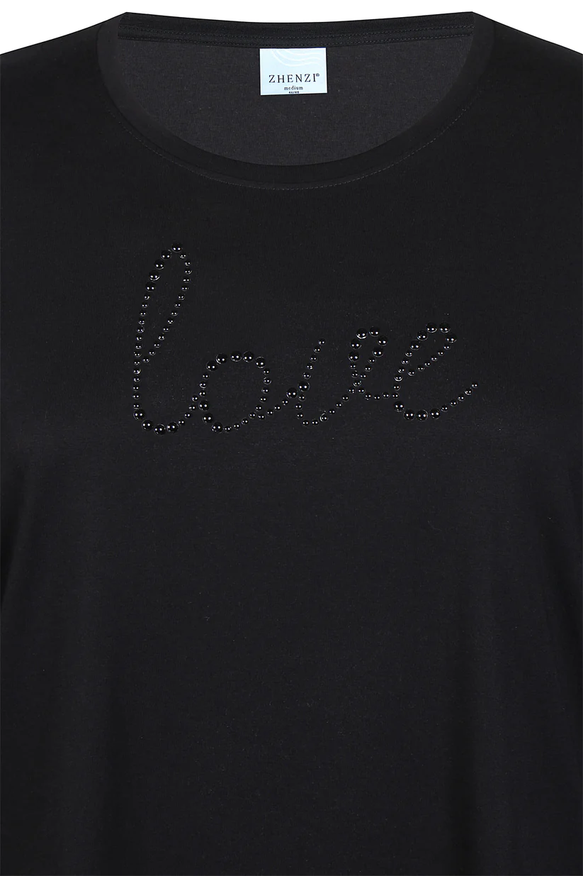 T-shirten har lange ærmer og en klassisk rund hals, hvilket gør den nem at style og perfekt som både enkeltstående top eller under en cardigan eller jakke. På brystet er der tilføjet et unikt og dekorativt element – fine sorte nitter, der danner ordet “L.O.V.E.”, som giver blusen et moderne og cool udtryk.