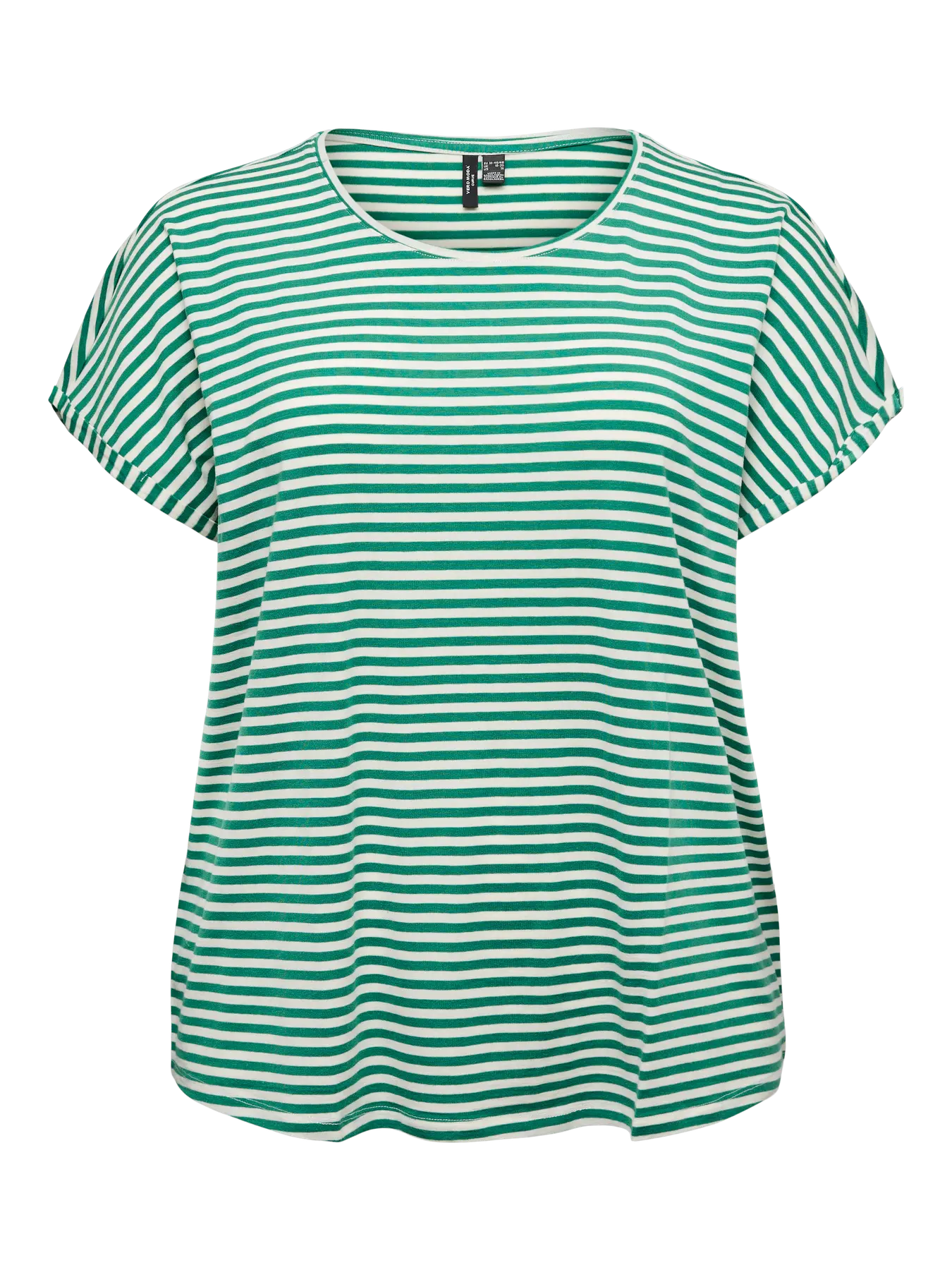 Designet er enkelt, men super iøjnefaldende i grønne striber med hvide streger – en farve og et mønster, der rammer forårets hotteste tendenser. T-shirten fungerer lige godt til jeans, en enkel nederdel eller som et lag under en åben skjorte eller vest.